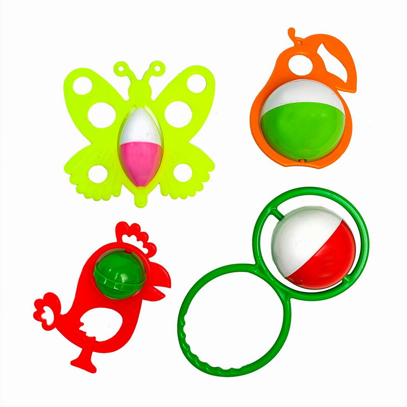 Состав набора: погремушка "Бабочка", погремушка « Груша », погремушка " Попугайчик ", погремушка «Лялечка»