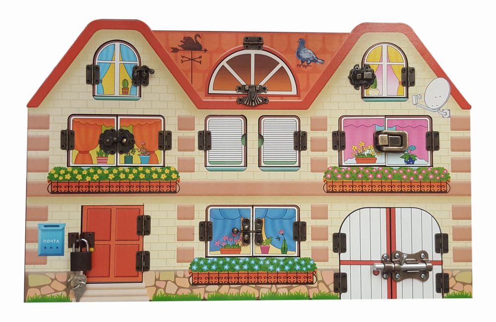Бизиборд "Дом, в котором мы живем" это увлекательная и полезная деревянная доска для развития мелкой моторики, внимания, логики, развитии речи, а так же игровая панель, которая познакомит ребенка с названием комнат и других помещений, которые находятся в доме.За каждой дверкой и за каждым окошком находится вкладыш в виде одной из комнат или помещений, а так же один из членов семьи. Например, на кухне готовить кушать мама, в детской играет ребенок, на чердаке спит кот и т.д.