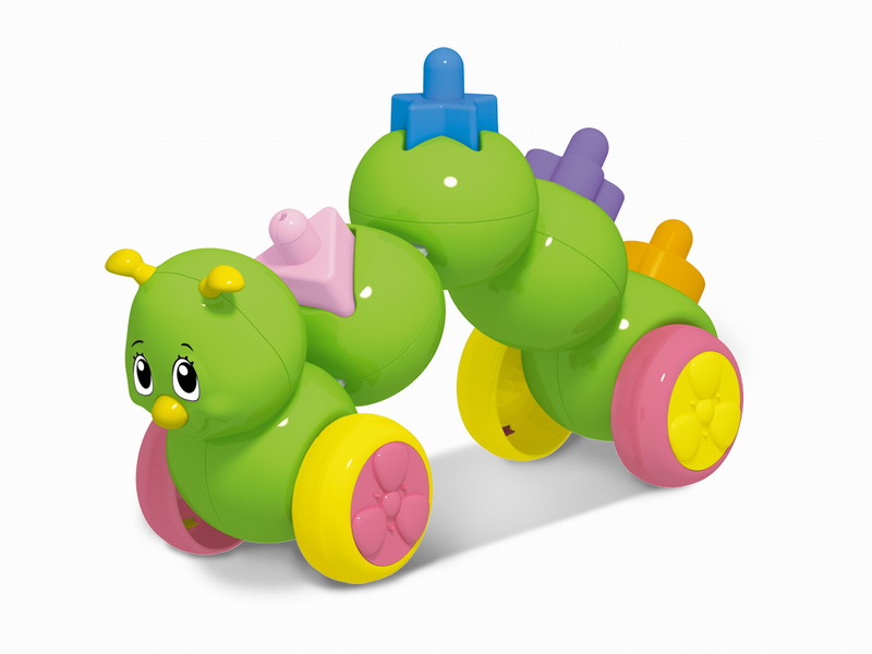 Деткам обязательно понравится играть с гусеничкой и наблюдать за тем, как пересыпаются разноцветные шарики в колесах при её движении.