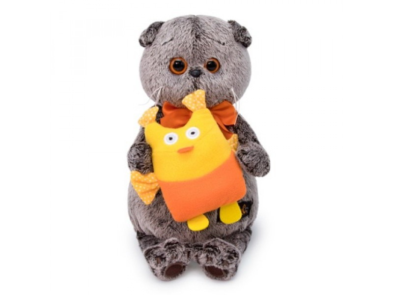 Кот Басик держит в лапках забавную игрушку – жёлтенькую сову, сшитую из флиса. Также на Басике оранжевый галстук-бабочка.