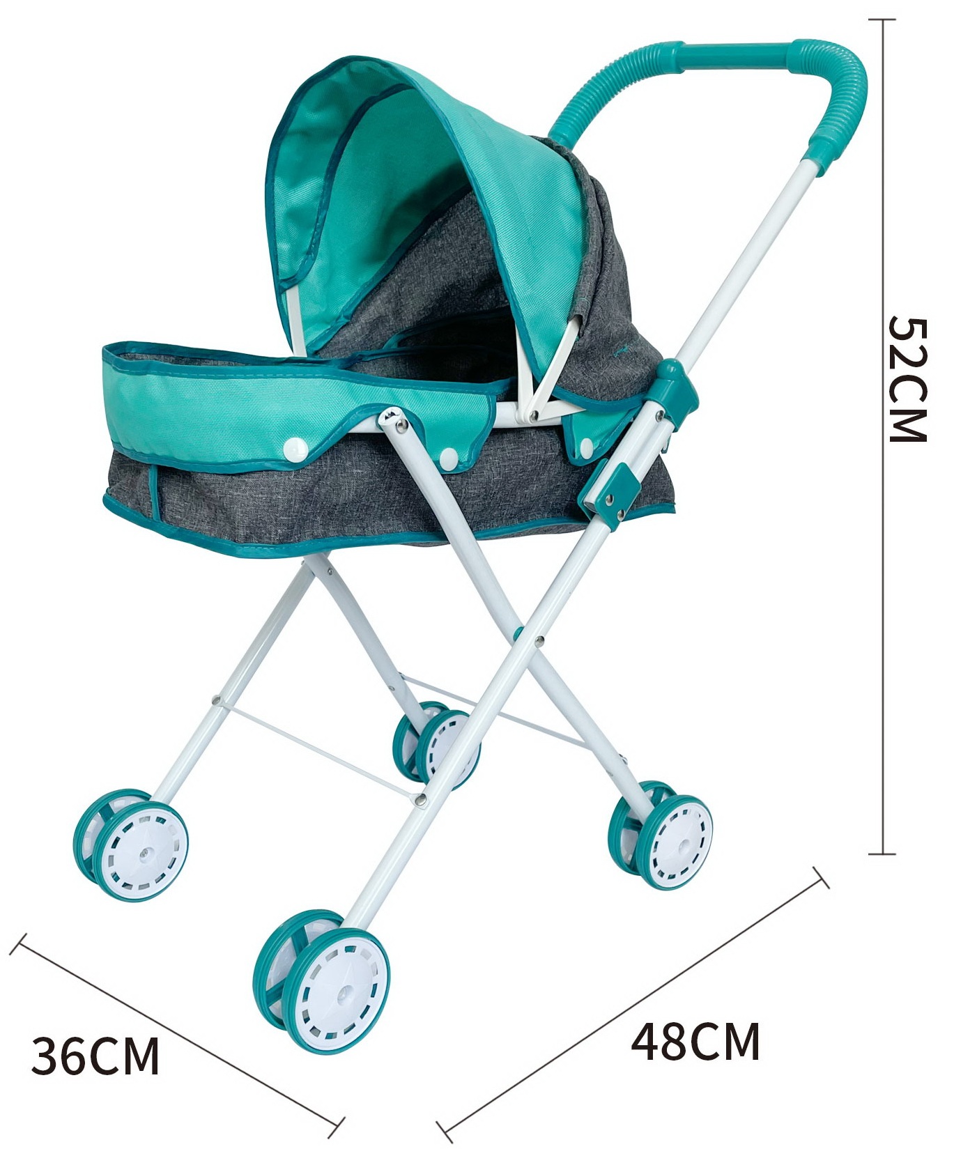 Коляска легко складывается и не занимает много места. Она оборудована козырьком, который защищает игрушку от солнца. Каркас сделан из лёгкого металла, крепления и колёсики — из пластика и резины, а сама коляска — из текстиля. Коляска разнообразит сюжетные игры малышек, помогая им развить фантазию, а также станет незаменимым атрибутом для их прогулок.