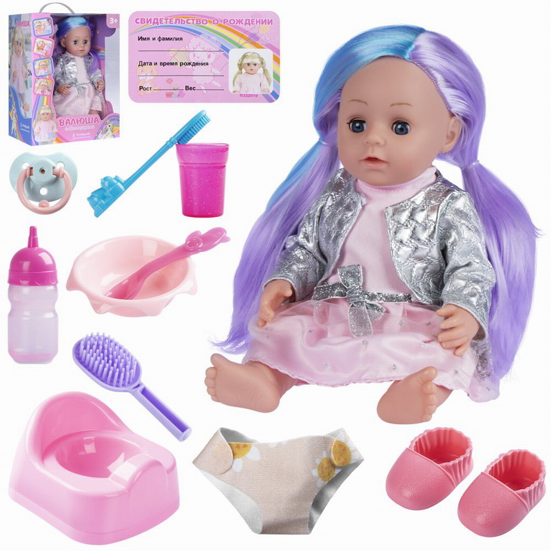 Комплект включает в себя все необходимое для заботы о Валюше: горшок, расческу, бутылочку, тарелку, ложку, свидетельство о рождение, трусики-подгузники и даже милые ботиночки.