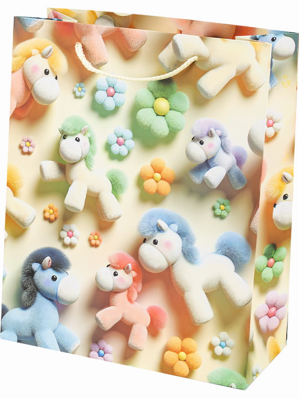 Пакет подарочный Пушистые пони с матовой ламинацией. Размер: 26х32х12 см (L), плотность: 210 г/м2.