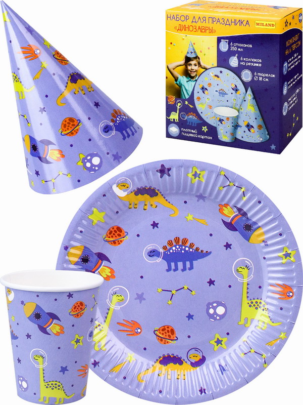 Яркий праздничный набор от компании "Миленд" украсит стол, порадует виновника торжества и его гостей. Красочное и качественное изображение на посуде создаст незабываемое настроение на любом мероприятии. Набор поможет сэкономить время организации события и уборки после праздника. Одноразовую бумажную посуду можно взять с собой на природу, так как она лёгкая, не занимает много пространства и не бьётся. Посуду можно использовать под холодные и горячие блюда, она изготовлена из высококачественного материала высокой плотности, который не влияет на вкус еды. Набор включает в себя: 6 тарелок, 6 стаканов, 6 праздничных колпачков.