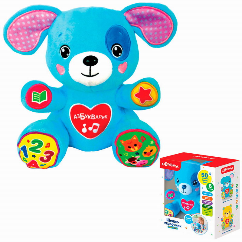 Сказочник умеет разговаривать голосами зверят и расскажет ребёнку 6 сказок: «Курочка Ряба», «Три медведя», «Солнышко», «Пузырь, соломинка и лапоть», «Репка», «Гав-гав». Он споет 4 обучающие песенки про алфавит, счет, формы и цвета, 6 веселых песенок о зверятах.