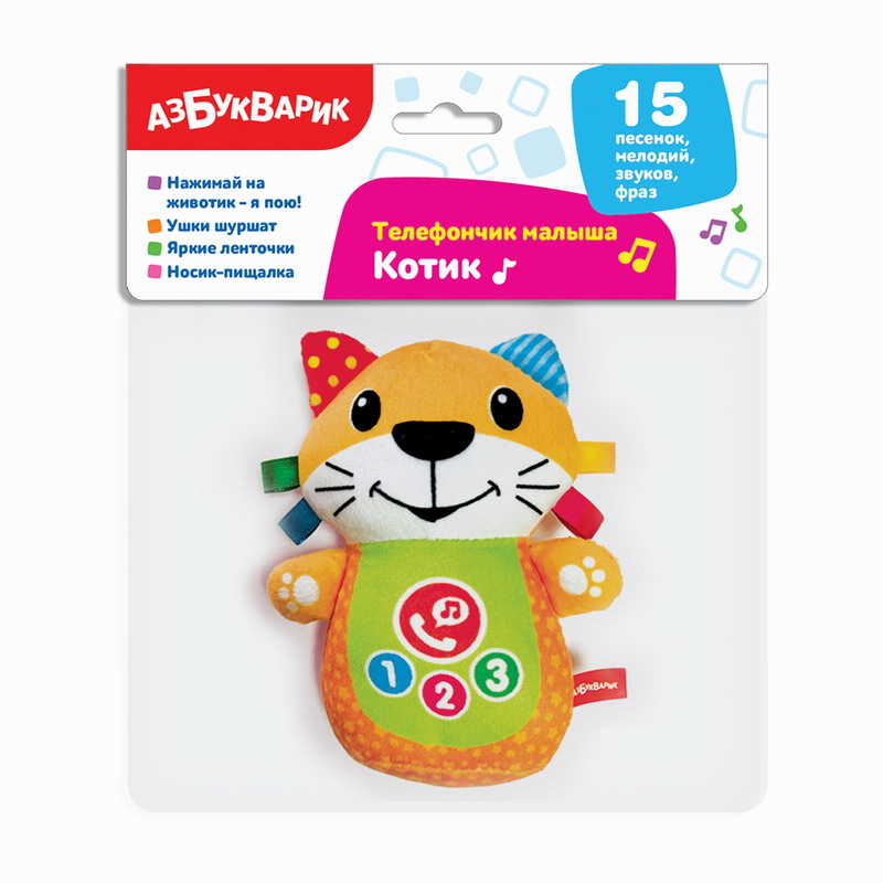 Игры с котиком из серии «Телефончик малыша» прекрасно развивают воображение и слуховое восприятие. А тактильные элементы игрушки – шуршащие ушки и яркие ленточки на голове – помогут в развитии мелкой моторики.