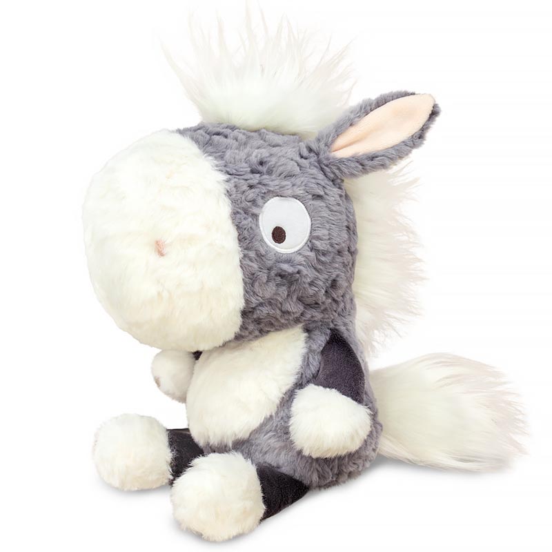 Малыш Эдди сшит из тактильно-приятного меха с небольшим завитком дымчато-серого цвета. Мордочка, грудка и копыта из молочного мягкого меха, а сами ножки из плотно-серого софта. Грива и хвост из длинного прямого меха. В ушки вшит бледно-розовый софт.